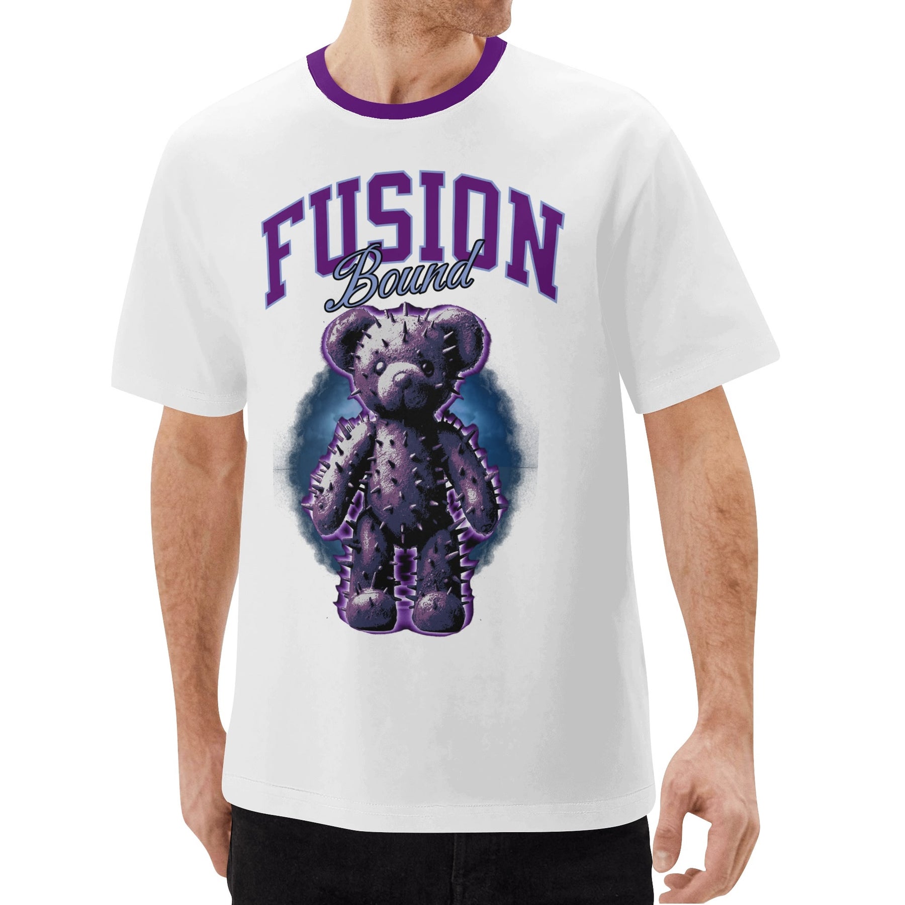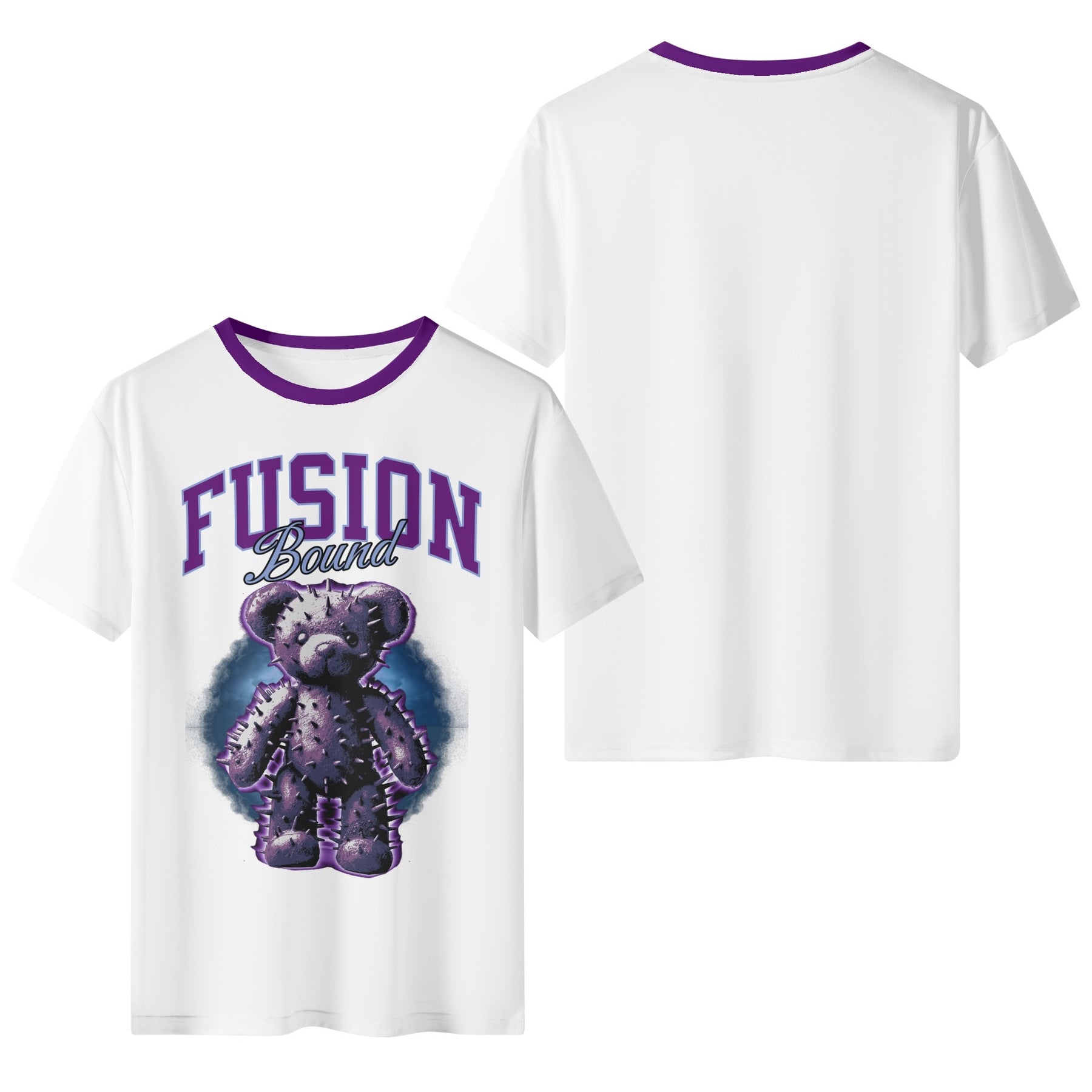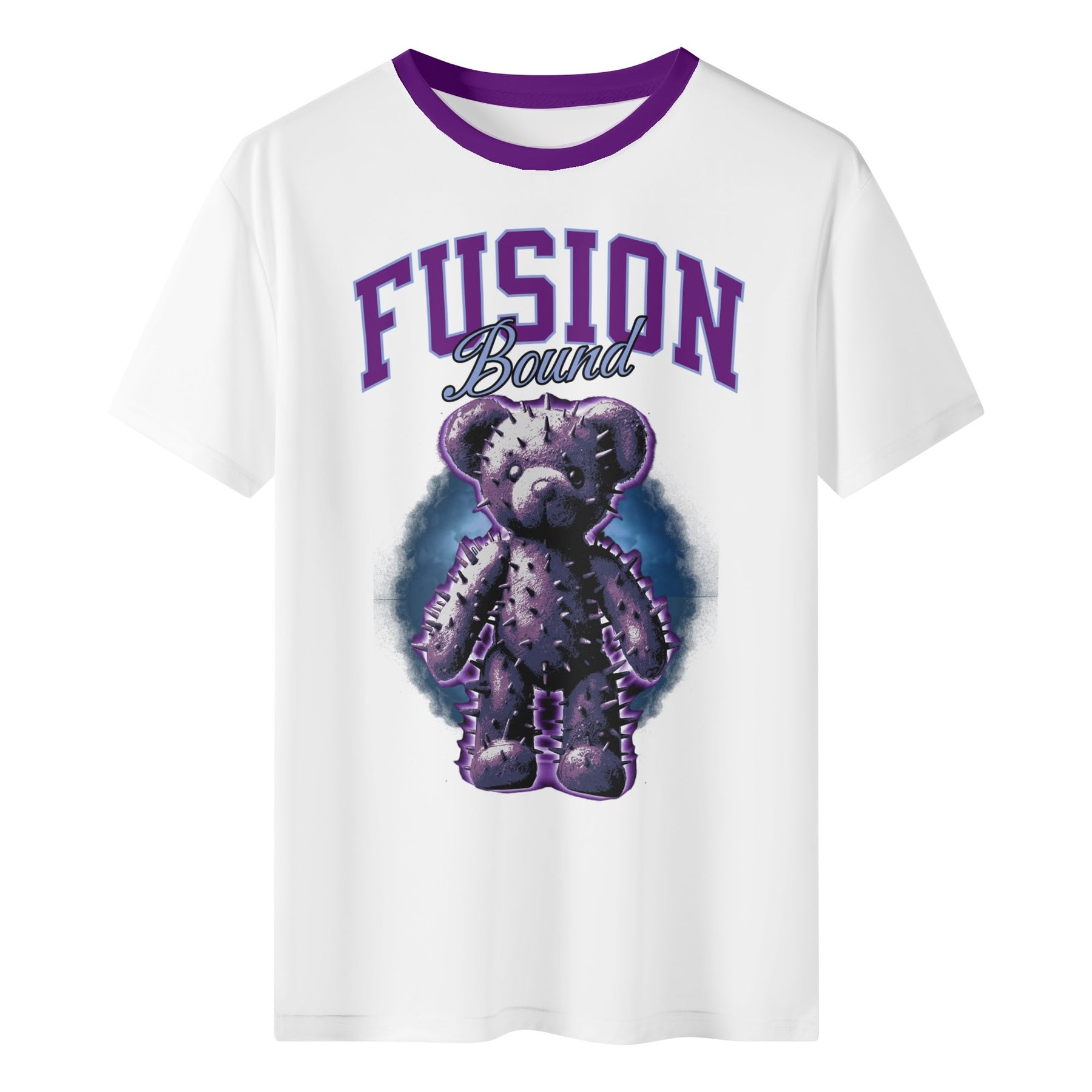 Unleash your bold holiday spirit with the FUSIION Bond T-Shirt, a wearable masterpiece that merges pop art and streetwear into one striking visual statement. This t-shirt features a unique spiked teddy bear illustration on a gradient background, paired with a contrasting purple collar and collegiate-style typography for an edgy, graphic look.